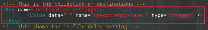 <Key name="Destination Settings"> <Value data="1" name="concurrency-level" type="integer" /> </Key>